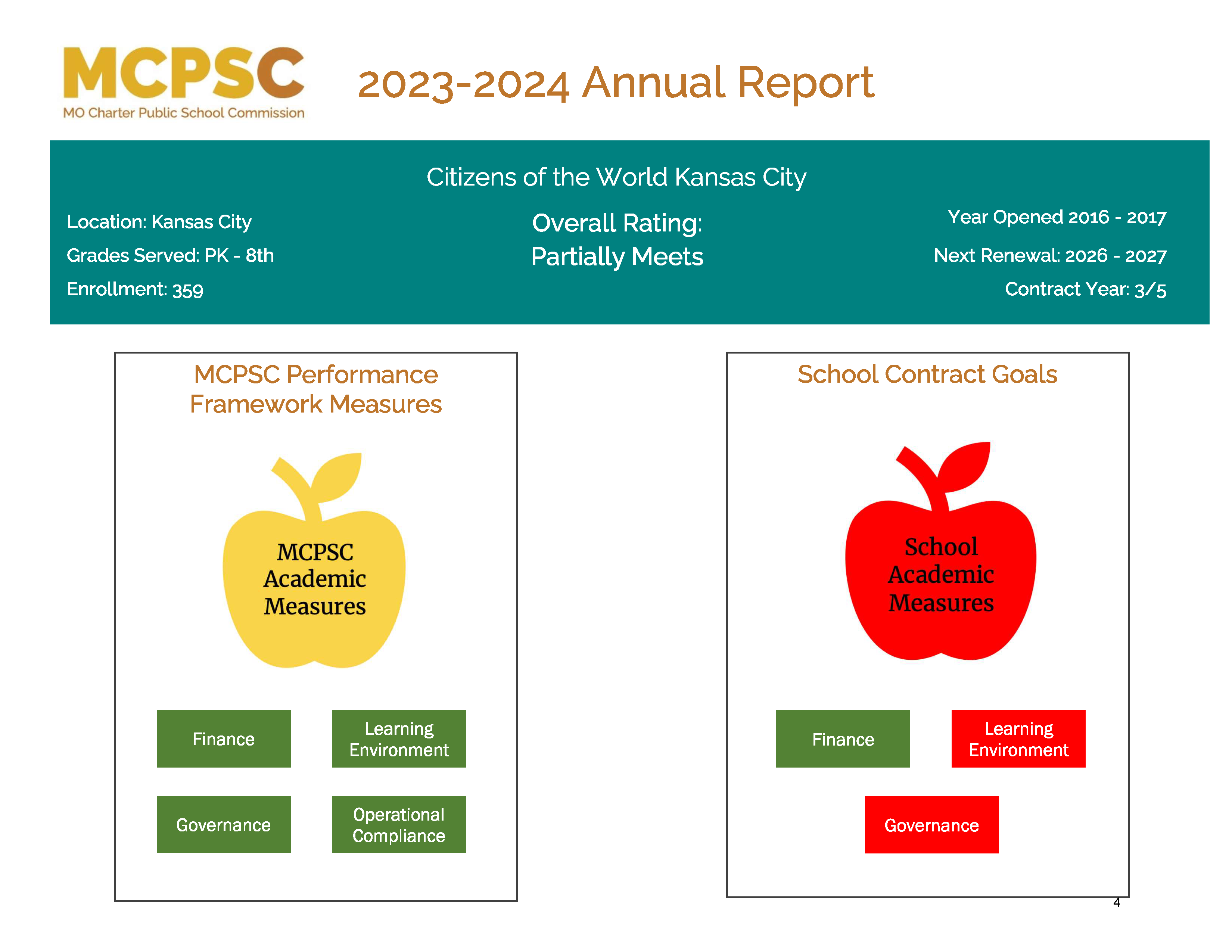 MCPSC produces annual reports for each school in our portfolio. Below are the summary reports for each school. Linked to each summary is the full annual report which includes information on a school’s performance in five areas: Academics, Finance, Learning Environment, Governance and Operations. Within the linked report there is an overview of each indicator and how determinations are made.